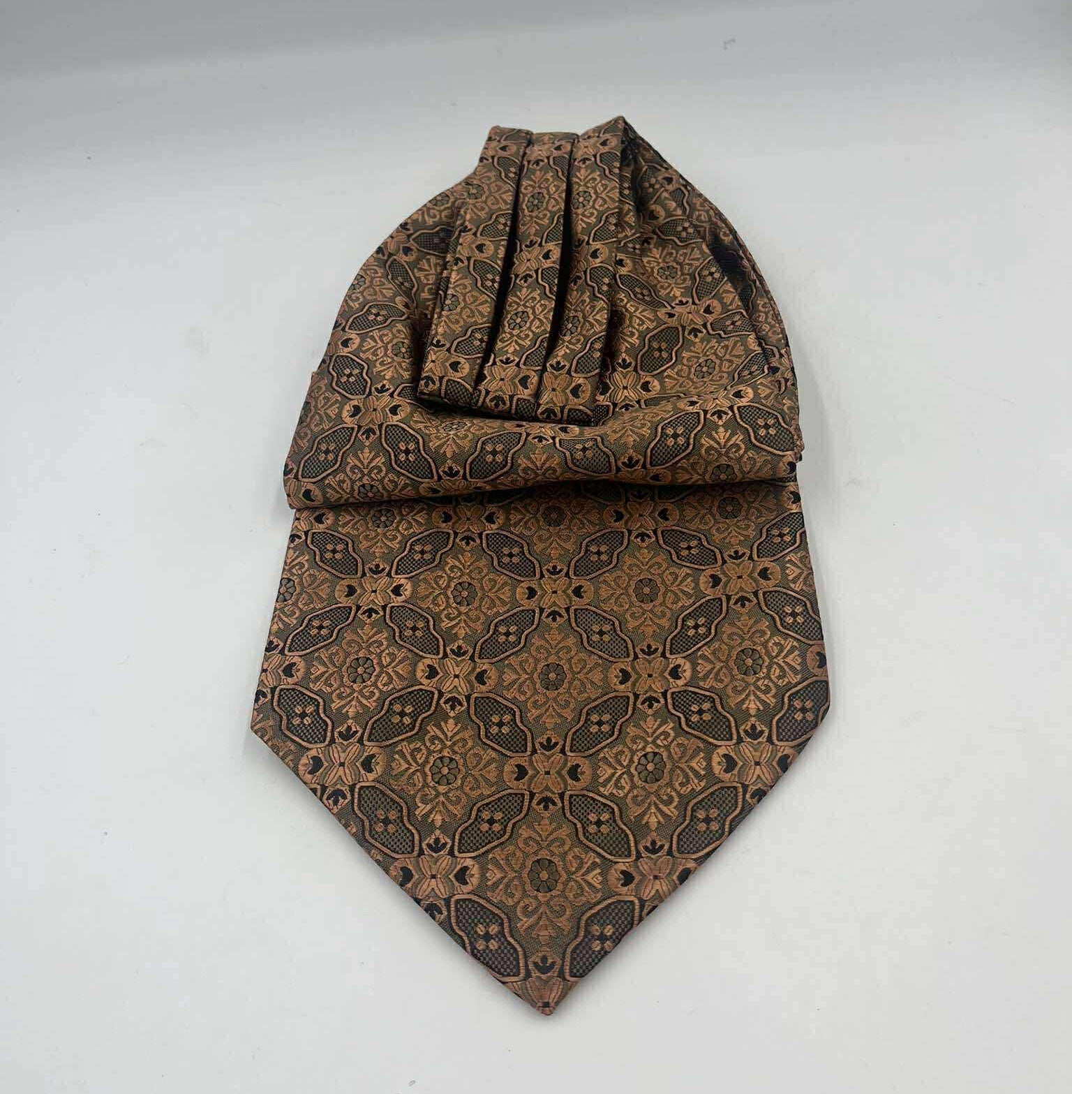 This luxurious medium briwn style patterned ascot tie cravat is perfect for weddings or formal events. Standard length. 116cm. Silk blend fabric. Premium quality.
