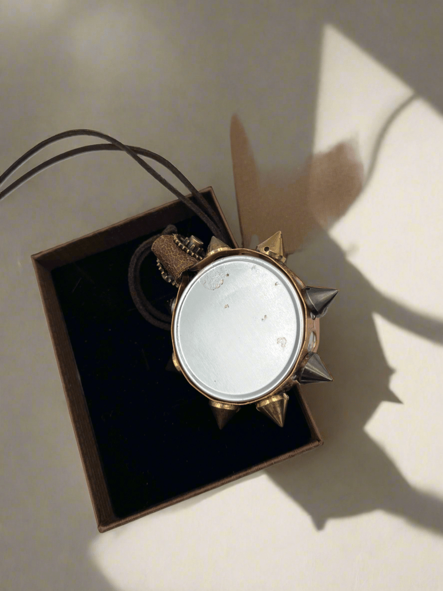 This is a standard basic aluminium outdoor camping compass which has been reimagined to wear as a pendant. It includes added metal spikes, genuine copper wrap, leather offcuts, metal alloy gear charms