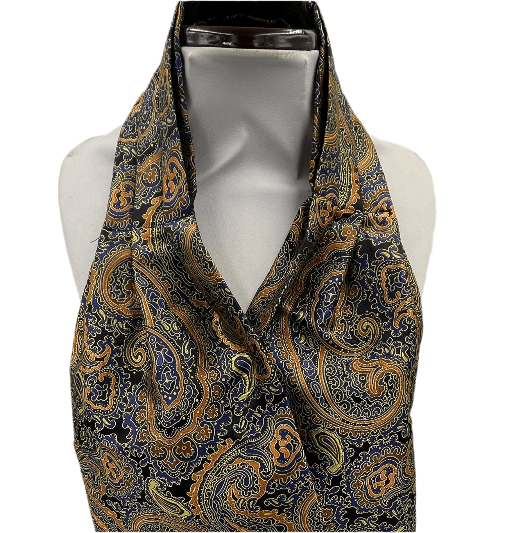 Vintage classic style orange and blue Paisley cravat. Fabric is a silk blend. Standard size. Mens formalwear accessory for weddings and formal events. Luxurious premium fashion accessory.